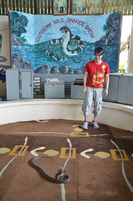 And photos of the snake and monkey show. They had different snakes including the king cobra. There was a little circular area which acted as a stage and you could go down and well, touch or provoke the snakes if you wanted to. Or dared to. :) The snake handler is in the same area in case something bad happens.